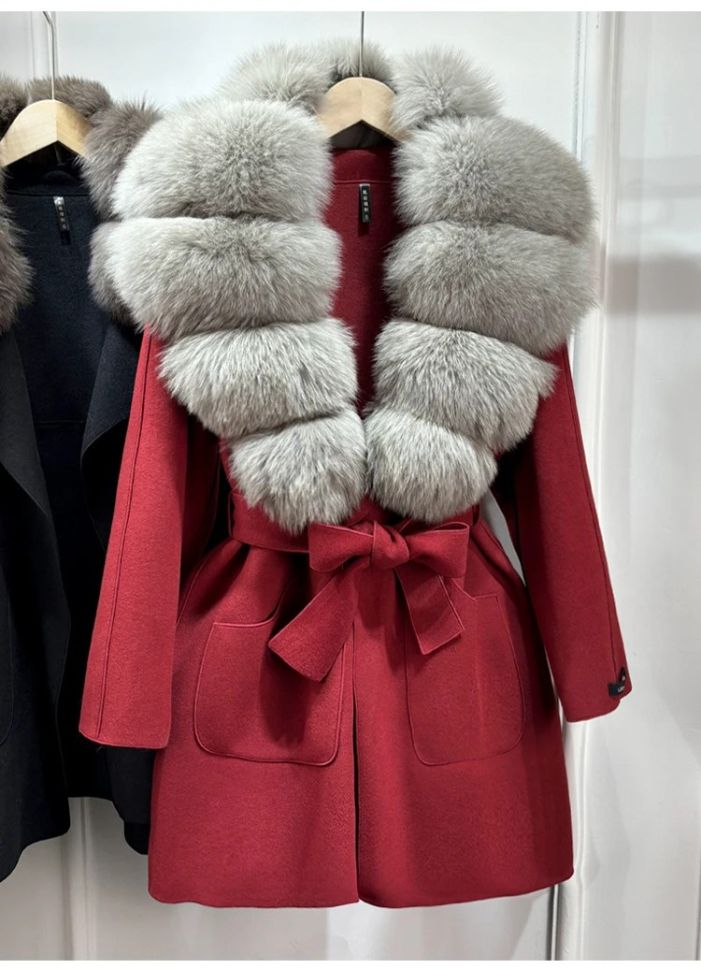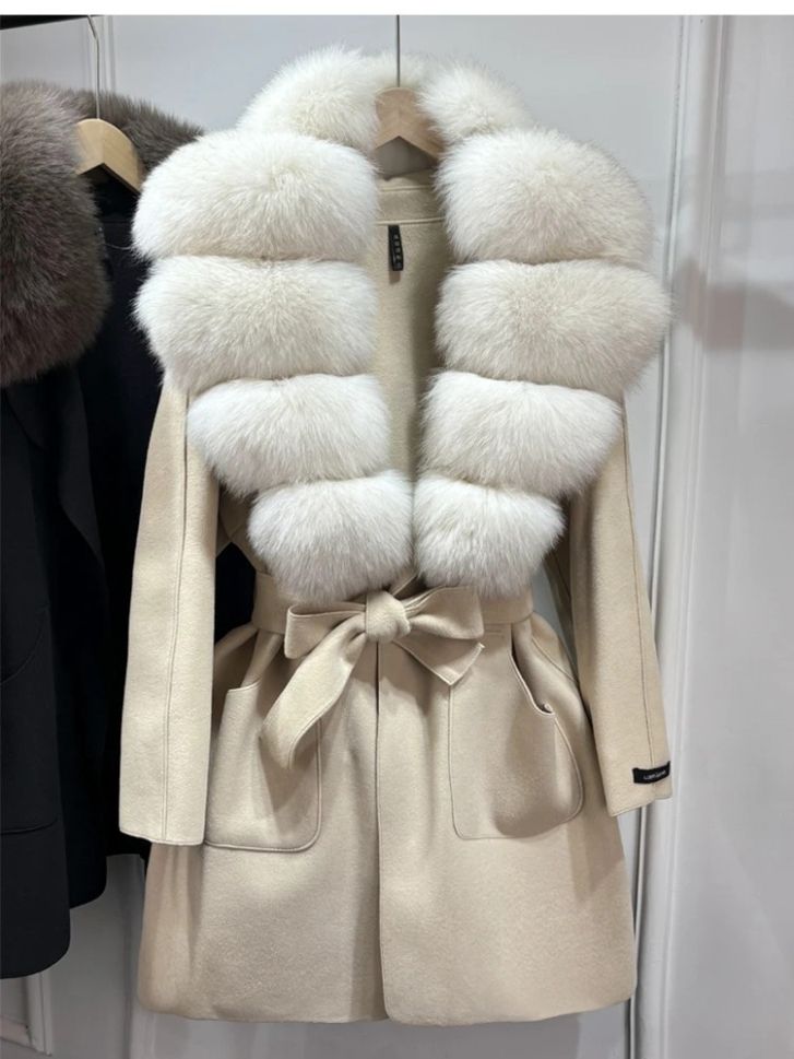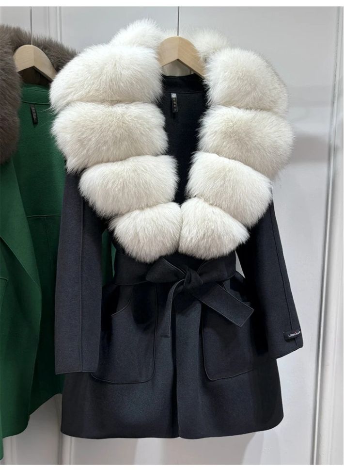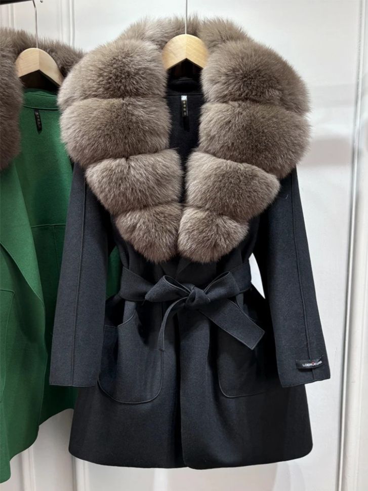 Луксозно естествено вълнено палто с голяма яка лисица , с колан и джобове, свободно, ежедневно, зимно
