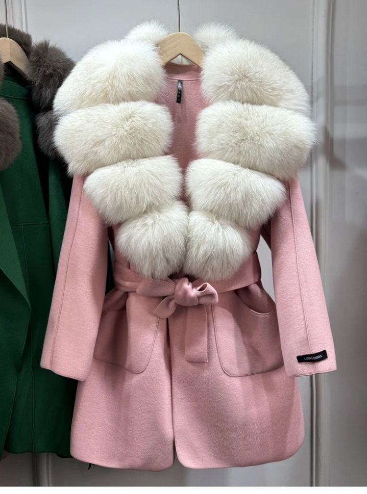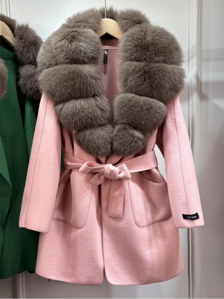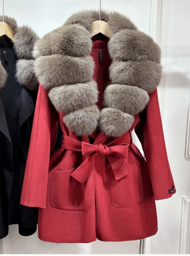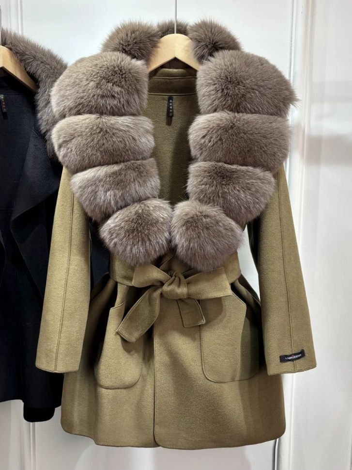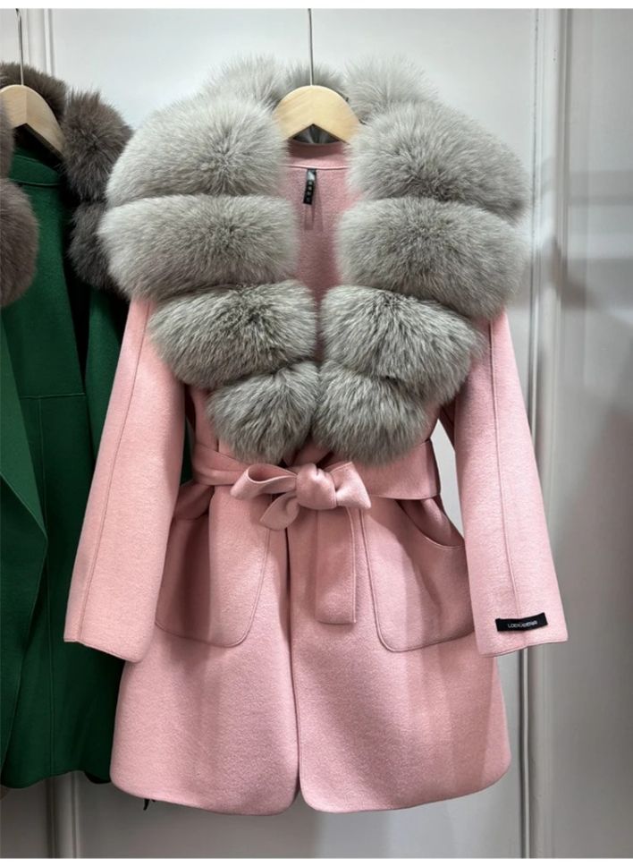 Луксозно естествено вълнено палто с голяма яка лисица , с колан и джобове, свободно, ежедневно, зимно