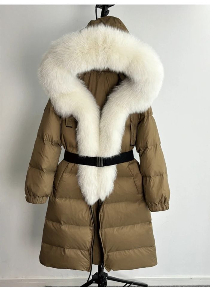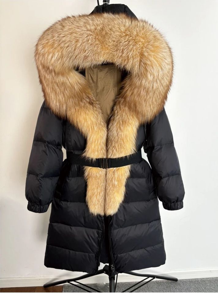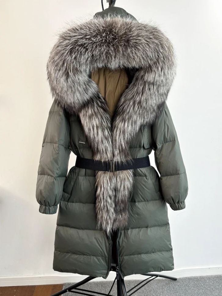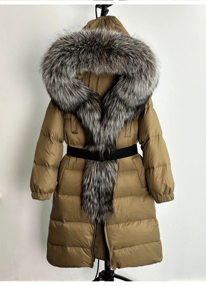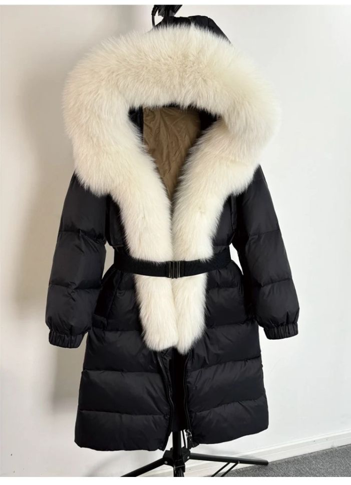 Зимно голямо палто - истинска сребърна лисица с яка и качулка, удебелено, топло, свободно с колан и патешки пух