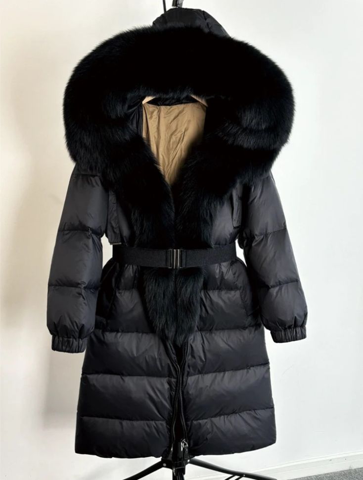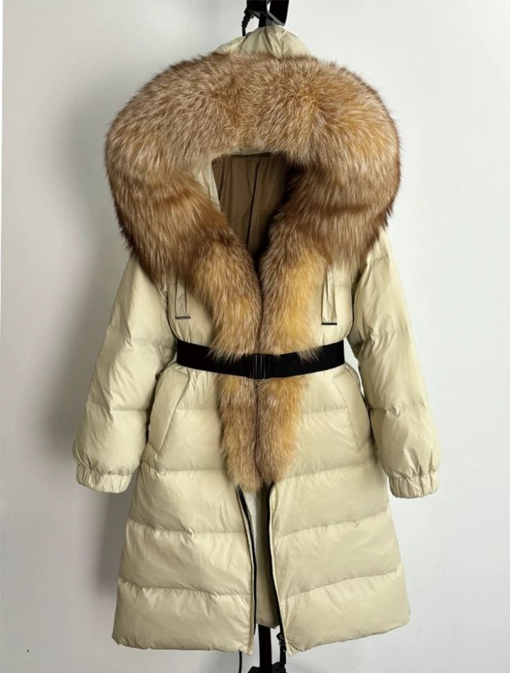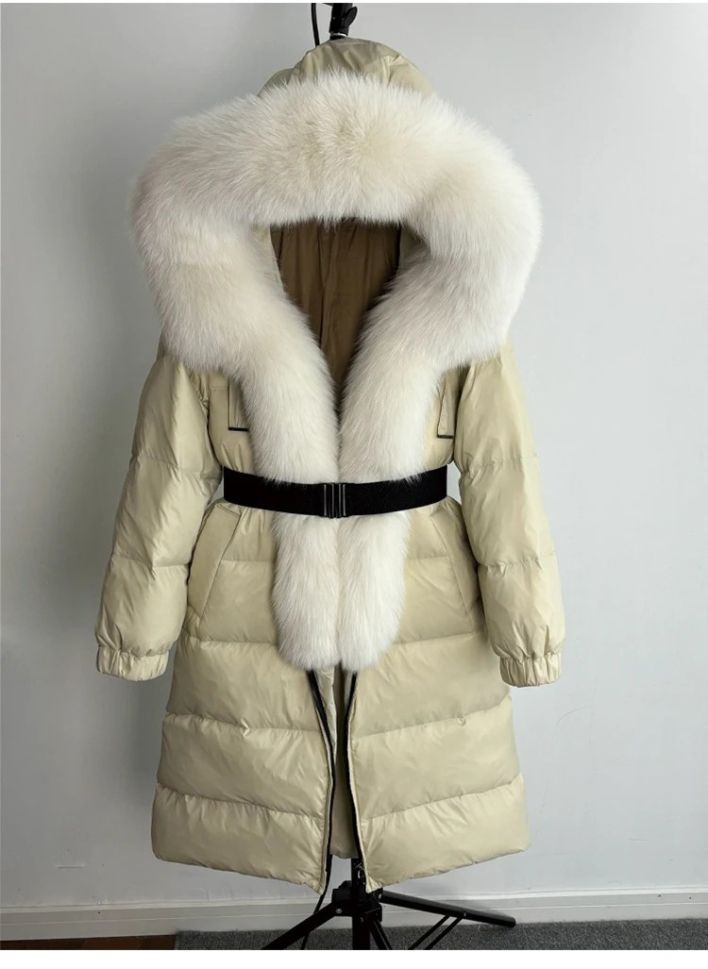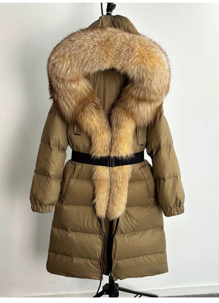 Зимно голямо палто - истинска сребърна лисица с яка и качулка, удебелено, топло, свободно с колан и патешки пух