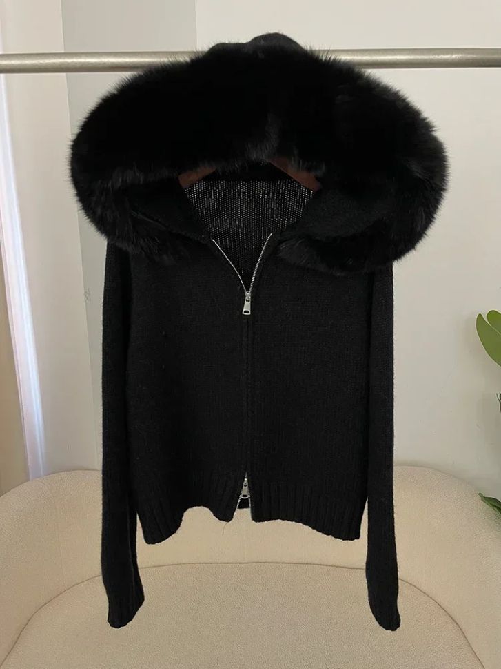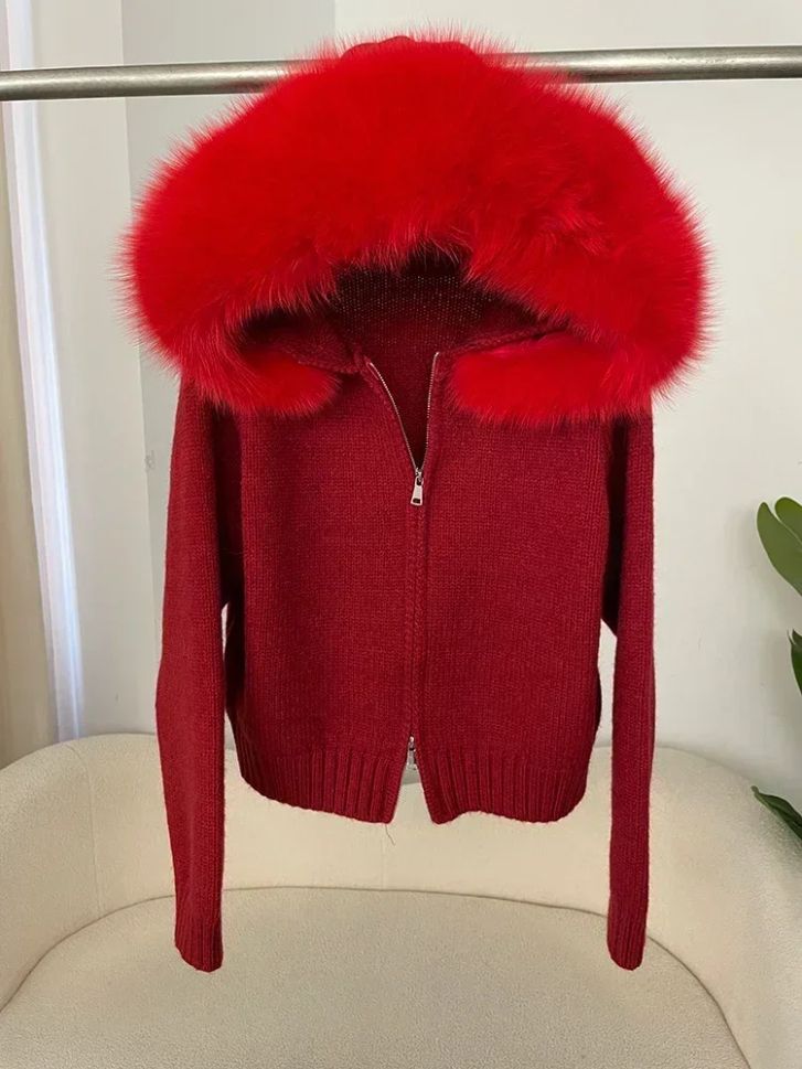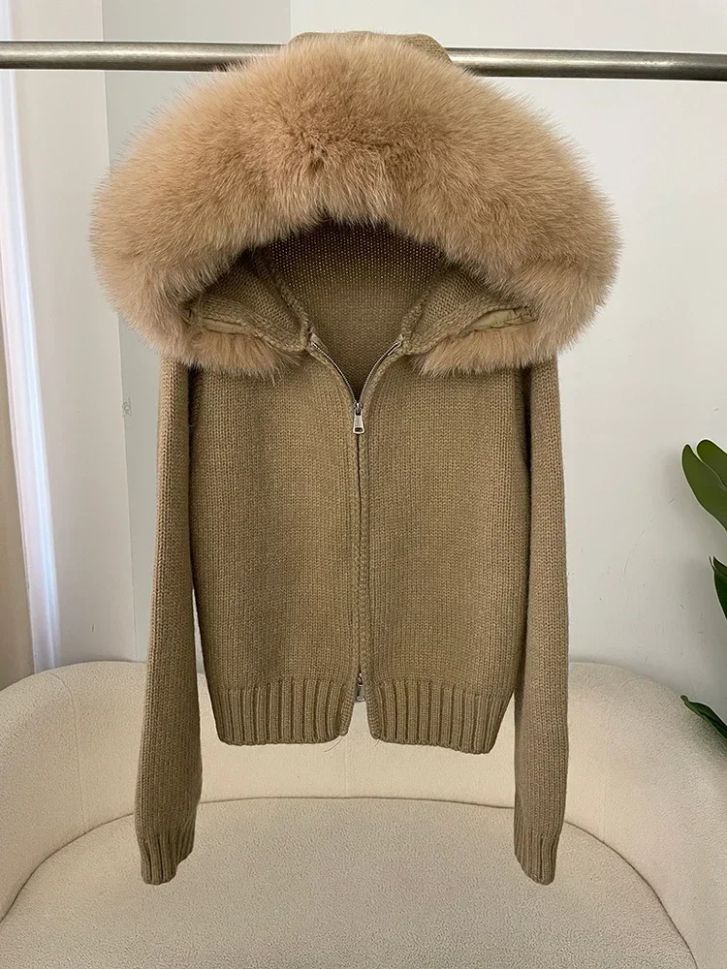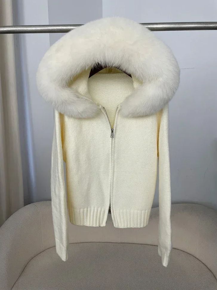 Дамска плетена жилетка с качулка и яка от естествен косъм лисица,Дамска плетена жилетка с яка от естествен косъм лисица,Дамски елек без ръкави от естествена овча кожа,Дамски елек без ръкави с качулка,Дамска грейка с гъши пух и естествен косъм на качулката
